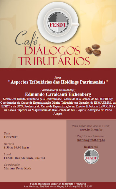 Café Diálogos Tributários, coordenado pela Dra. Mariana Porto Koch, dia 15/03/2017 na FESDT – Fundação Escola Superior de Direito Tributário por Laury Ernesto Koch | fev 22, 2017 | Blog | 0 Comentários Enviar Comentário Cancelar respostaO seu endereço de e-mail não será publicado. Campos obrigatórios são marcados com *Comentário * Nome * E-mail * Site Salvar meus dados neste navegador para a próxima vez que eu comentar.