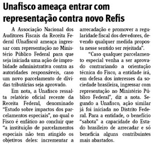 REFIS – Unafisco ameaça boicotar um possivel novo parcelamento – Notícias Koch Advogados por Laury Ernesto Koch | out 14, 2016 | Blog | 0 Comentários Fiscais da Receita Federal são contrários ao REFIS e ameaçam ingressar na justiça caso ocorra um novo parcelamento tributário. (Jornal do Comércio – pg 13 – 14.10.2016) Enviar Comentário Cancelar respostaO seu endereço de e-mail não será publicado. Campos obrigatórios são marcados com *Comentário * Nome * E-mail * Site Salvar meus dados neste navegador para a próxima vez que eu comentar.